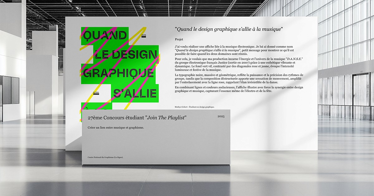 Intitulé "Join The Playlist", ce concours invite les étudiants en design graphique et arts visuels à explorer les liens entre musique et graphisme. Ils doivent proposer une création qui interprète graphiquement l’idée de playlist : sa structure, son rythme, son interaction avec nos expériences. Tous les supports sont envisageables, du numérique à l’impression, avec une approche innovante et personnelle.