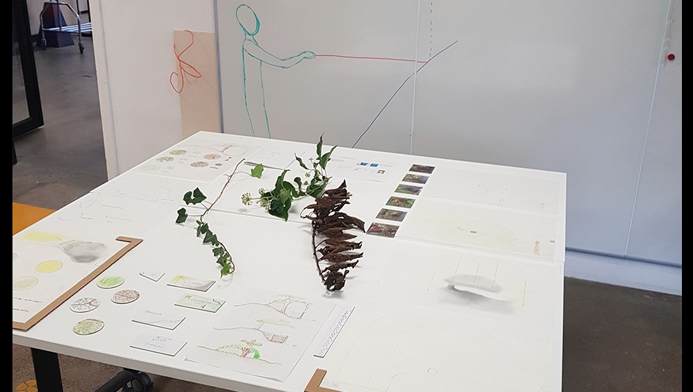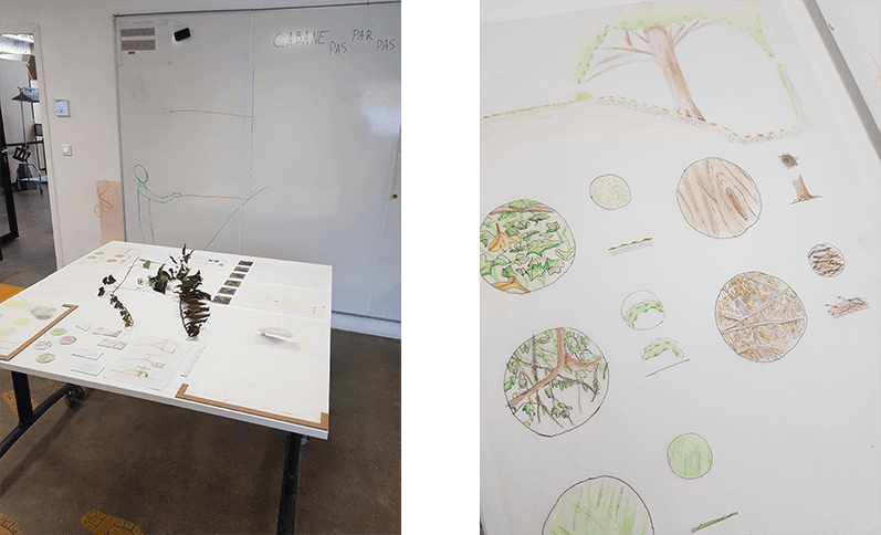 Avec mon binôme, nous avons pensé à la cabane que l’on construit en extérieur. Pour cela, nous avons réalisé un plan architectural donnant à l’expérience un aspect très sérieux et professionnel, alors qu’il ne s’agit en réalité que d’une cabane d’enfant. Nous voulions créer ce contraste à travers nos supports.