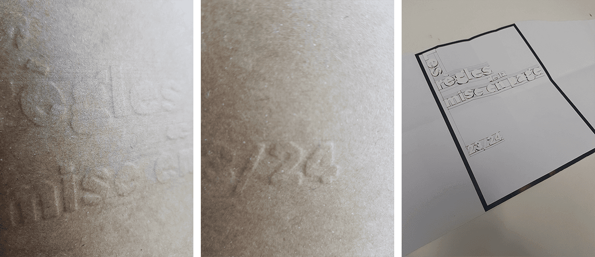 La première de couverture a été confectionnée à partir d’un papier cartonné sur lequel nous avons d’abord imprimé la grille, laissée apparente. Pour le texte, nous avons eu l’idée de le gaufrer à l’aide de carton plume.