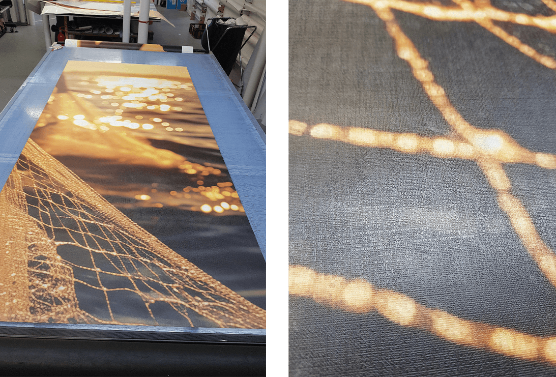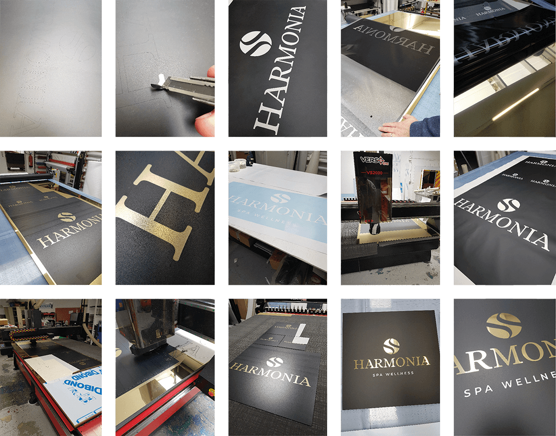 Échenillage, plastification et découpe sur plaque composite aluminium (Dibond) pour HARMONIA.