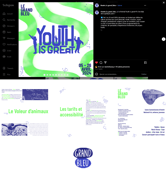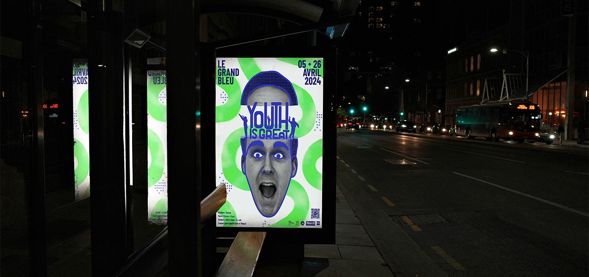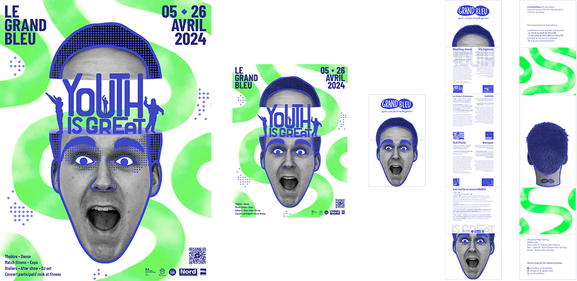 Projet workshop avec Kyllian Mazuard, Samuel Vergé et Tom Zimniewski en collaboration avec le Théâtre Le Grand Bleu, création d’une identité visuelle pour le festival "Youth Is Great" à l’occasion de l’année olympique.